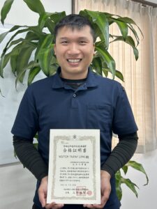 日本語での講習で難しい講習ではありましたが、無事合格の知らせを聞き本人も安堵したようです。